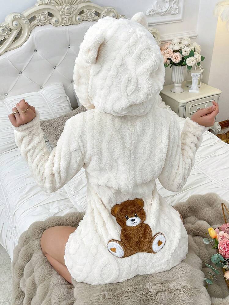 Combinaison-pyjama En Peluche Douce Et Moelleuse À Capuche Avec Broderies Représentant Un Ours En Peluche, Pour Femme. Détails Confortables Et Élégants, Idéale Pour L'automne Et L'hiver.
