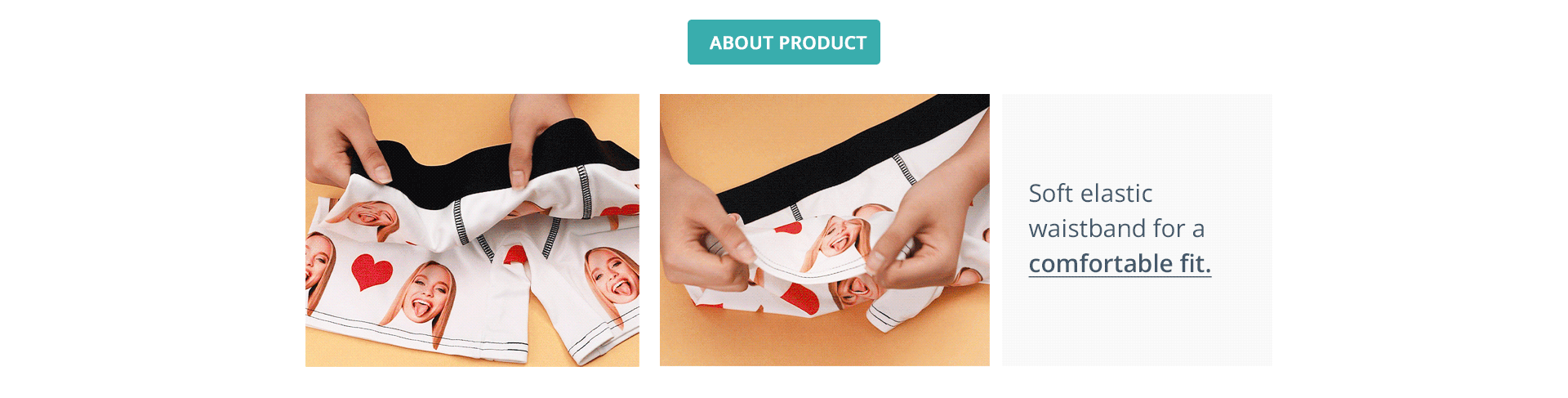 - Produits associés : boxers personnalisés, culottes personnalisées, chaussettes personnalisées, t-shirts photo, maillots de bain personnalisés, chemises hawaïenne personnalisées.