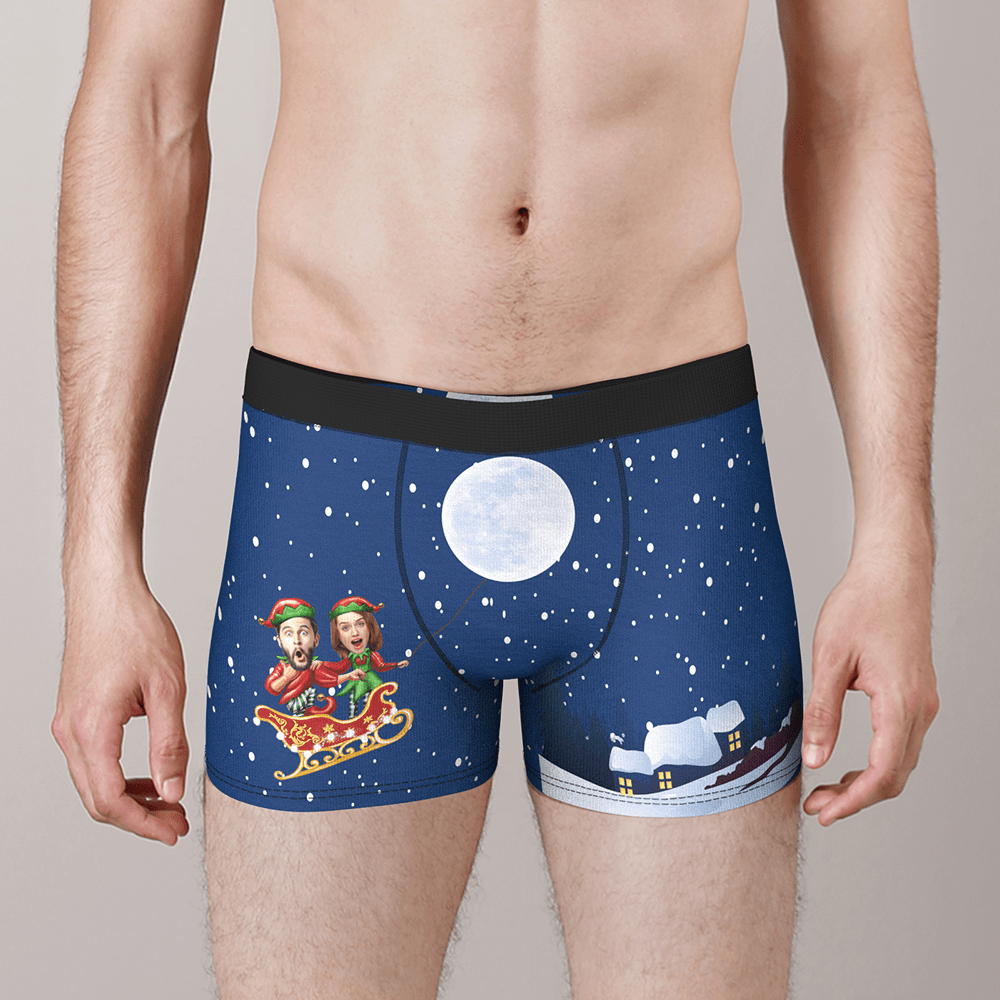 Caleçon Personnalisé Visage Avec Couple d'Elfe Cadeaude de Noël Pour Lui