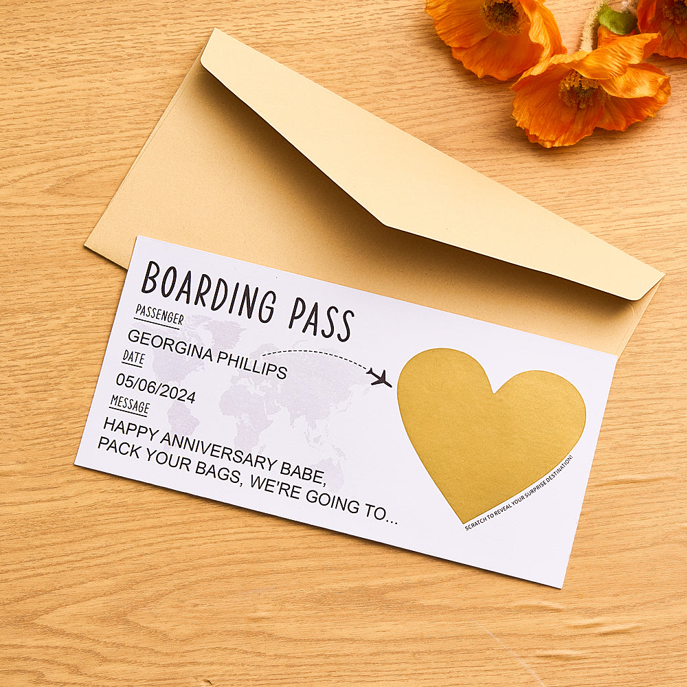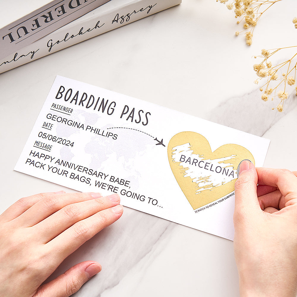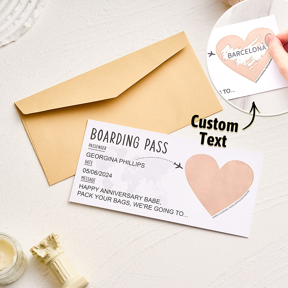 - Rendez votre voyage de vacances surprise encore plus mémorable avec notre carte à gratter personnalisée pour carte d'embarquement avec enveloppe ! Idéale pour les couples, cette carte personnalisée comporte une section à gratter qui cache la destination de votre voyage.