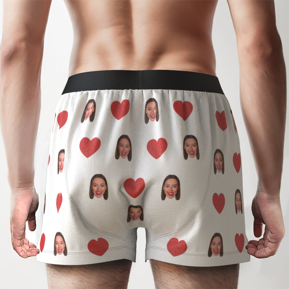 - Ces sous-vêtements décontractés pour hommes présentent un motif cœur rouge vif avec une zone photo personnalisable, ajoutant une touche personnelle à sa garde-robe.