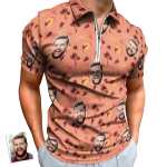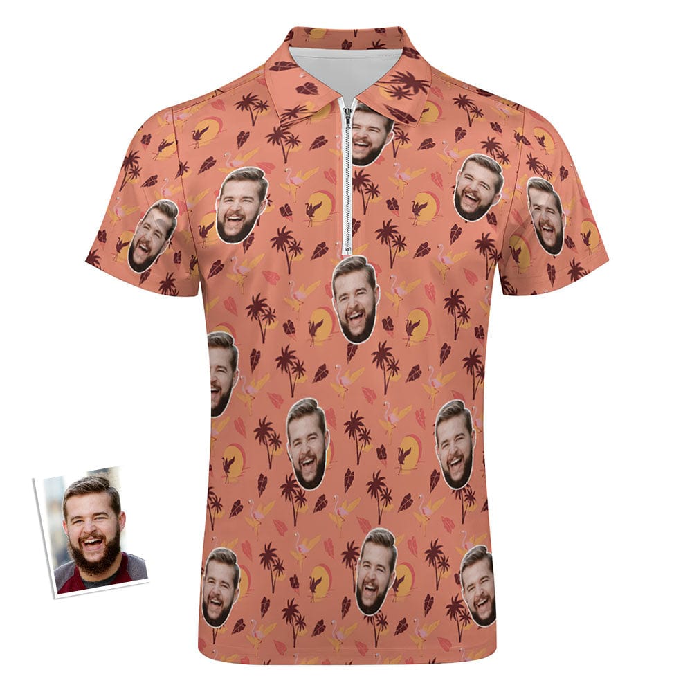 Polo Personnalisé Flamingo Tropical Sunset Pour Hommes, Visage Personnalisé, Polo Drôle Avec Fermeture Éclair