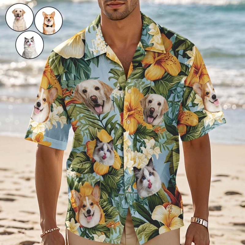 Chemise Hawaïenne Personnalisée Avec Fleurs Oranges, Chemise Hawaïenne Photo Personnalisée, Chemises De Fête Amusantes Pour Les Amoureux Des Animaux
