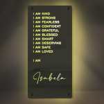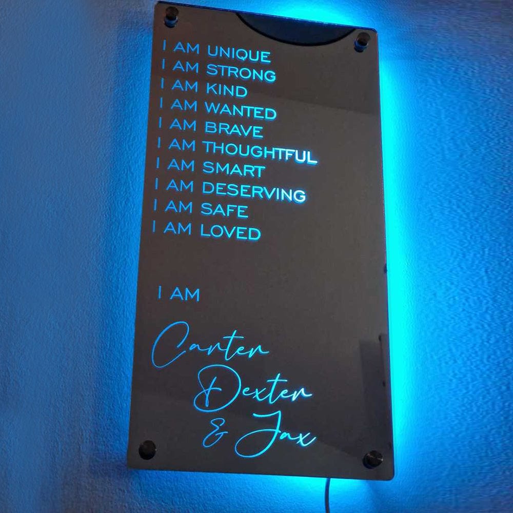 - This super stylish personalised name mirror with LED lighting is a perfect and unique edition to any youngsters bedroom, they will love lighting up the personalised mirror and seeing their own name in lights.This eye-catching personalised name mirror makes the perfect gift for 2023 and it will be cherished and loved for many years to come by the recipient.Includes remote control for LED lighting and chrome wall mounting stand offs.
