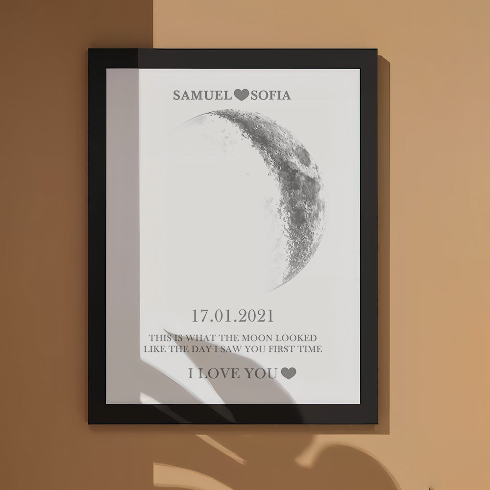 Le cadre en bois imprimé nuit de lune affiche la phase lunaire de la nuit de votre première rencontre ou du jour de votre naissance. Commémorez ces jours spéciaux et créez des souvenirs uniques et précieux de cette nuit spéciale.