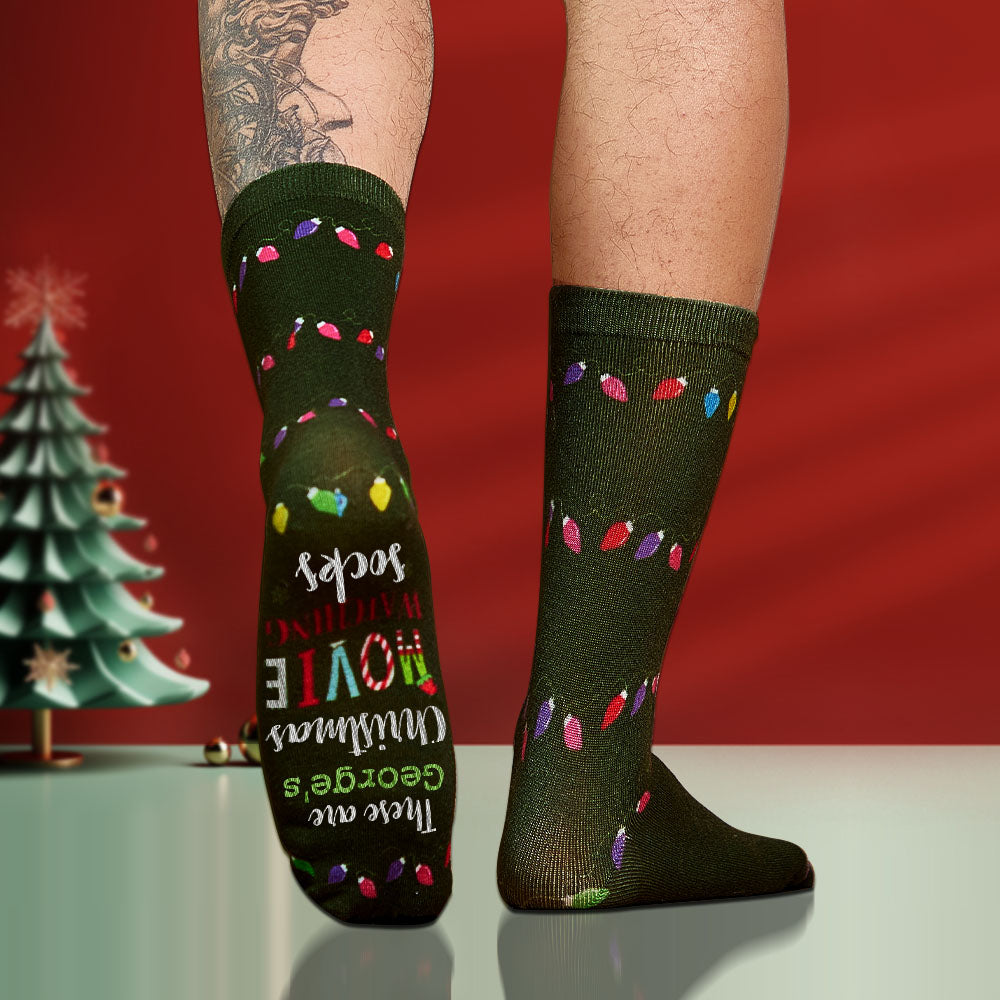 - Chaussettes lumineuses de Noël - Ajoutez une touche festive à votre garde-robe avec ces chaussettes de Noël amusantes. Les bas sont décorés de motifs de rubans lumineux colorés et d'un proverbe intéressant : 'Ce sont mes films de Noël en train de regarder des chaussettes'. Ils sont parfaits pour les fêtes de fin d'année !