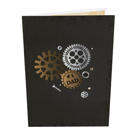 La carte comporte un écrou et un boulon gaufrés sur le recto avec la mention "#1 DAD" imprimée dessus. Après ouverture de la carte, un cœur en 3D avec des écrous et des boulons se trouve sur la base en bois. La mention "Bonne fête des pères" est inscrite en lettres noires sur le recto de ce modèle.