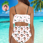 Imprimez votre visage sur un vrai bikini d'été à volants pour femme. Encouragez-vous ou montrez votre amour et votre soutien à votre bien-aimé avec votre idée géniale.