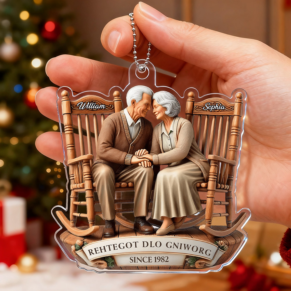 Ornement De Noël Personnalisé En Acrylique Représentant Un Vieux Couple Assis Sur Des Chaises Berçantes