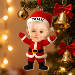 Ornée de la photo et du prénom de votre bébé sur un décor festif avec le Père Noël, des bonshommes en pain d'épice et des lutins, cette décoration capture la joie, les rires et l'émerveillement des fêtes de fin d'année.