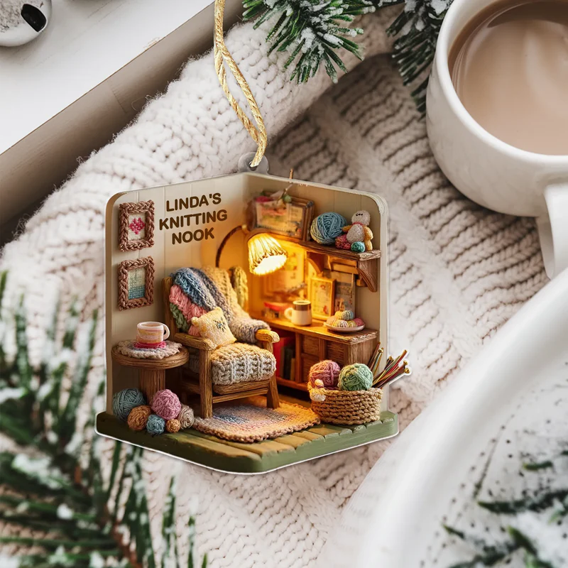 Créez une atmosphère chaleureuse de vacances avec cet Ornement de coin tricot personnalisé, conçu comme un petit coin douillet pour tout amateur de tricot. Doté d'un fauteuil moelleux, de pelotes de laine colorées, d'aiguilles à tricoter et d'une lampe lumineuse, il capture le confort et la joie de l'artisanat fait main.