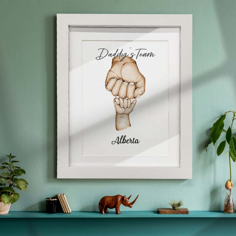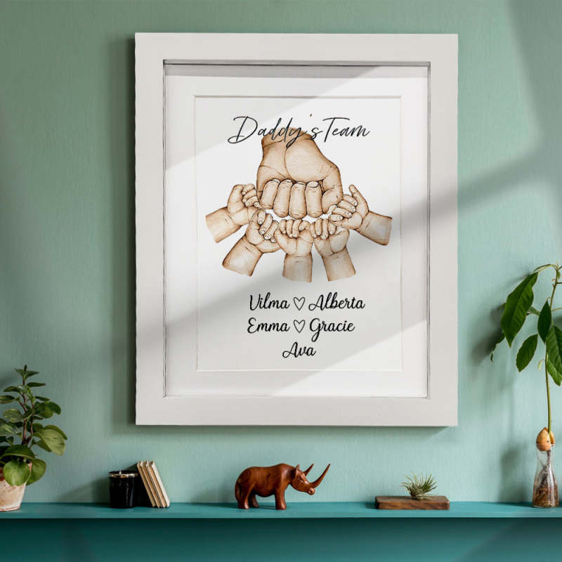 Ce joli et original cadeau aquarelle 'coup de poing' mettant en vedette papa et 'son équipe' peut être personnalisé pour inclure tous les noms de ses petites personnes préférées ! Cela ferait un cadeau de Noël, d'anniversaire, de fête des pères ou de «toute occasion» unique et pittoresque pour papa ou grand-père. Offrez le cadre Fist Bump comme un cadeau attentionné et regardez-le faire sourire.