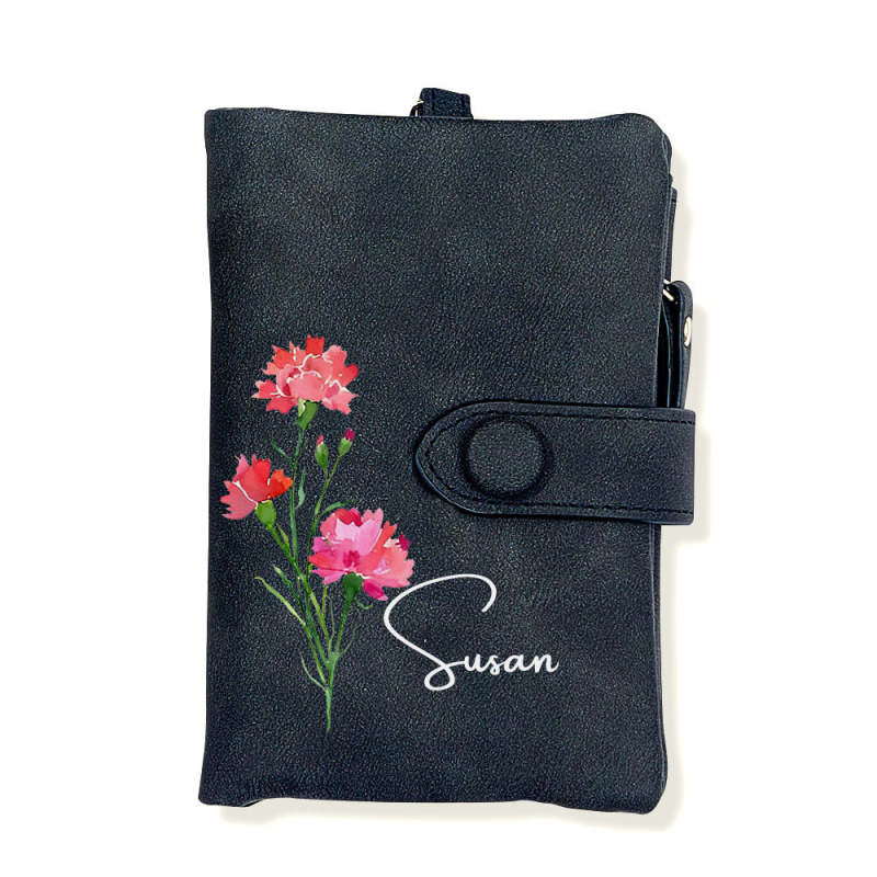 Personnalisé avec un nom et des fleurs d'anniversaire colorées pour rendre votre portefeuille plus spécial. Le matériau en cuir rend le portefeuille plus confortable à transporter. Ce portefeuille aux fleurs de naissance colorées peut également être un cadeau d'anniversaire personnalisé, un cadeau de remerciement ou un cadeau de fête des mères pour votre proche.