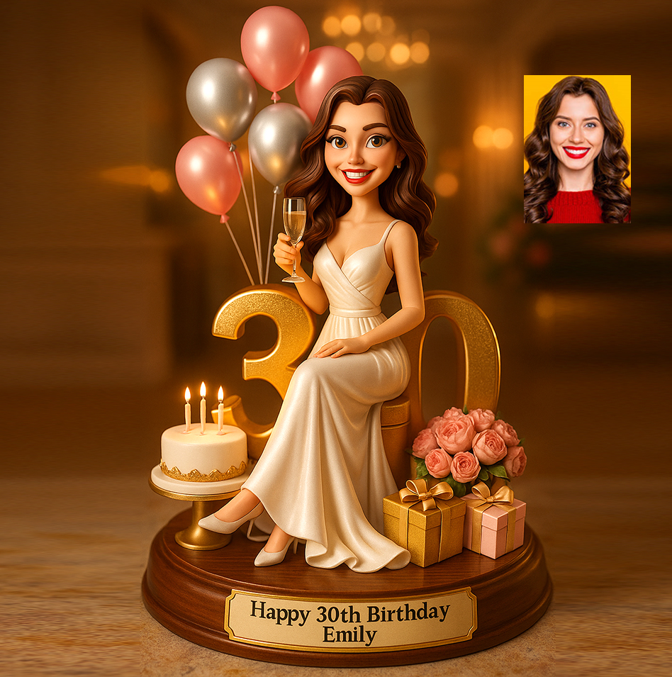 Entourée de ballons festifs, de boîtes cadeaux emballées et d'un grand « 30 » scintillant en arrière-plan, cette pièce capture la joie et le glamour d'un anniversaire marquant.