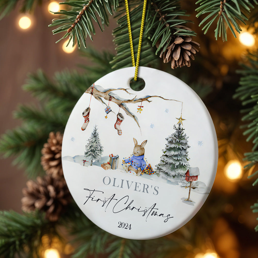 Ornement Personnalisé En Céramique De Lapin Avec Nom, Premier Ornement De Noël De Bébé, Cadeau De Noël Pour Nouveau Bébé