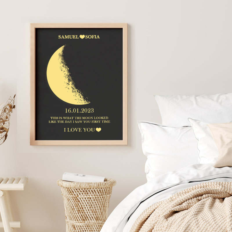 Le cadre en bois imprimé nuit de lune affiche la phase lunaire de la nuit de votre première rencontre ou du jour de votre naissance. Commémorez ces jours spéciaux et créez des souvenirs uniques et précieux de cette nuit spéciale.