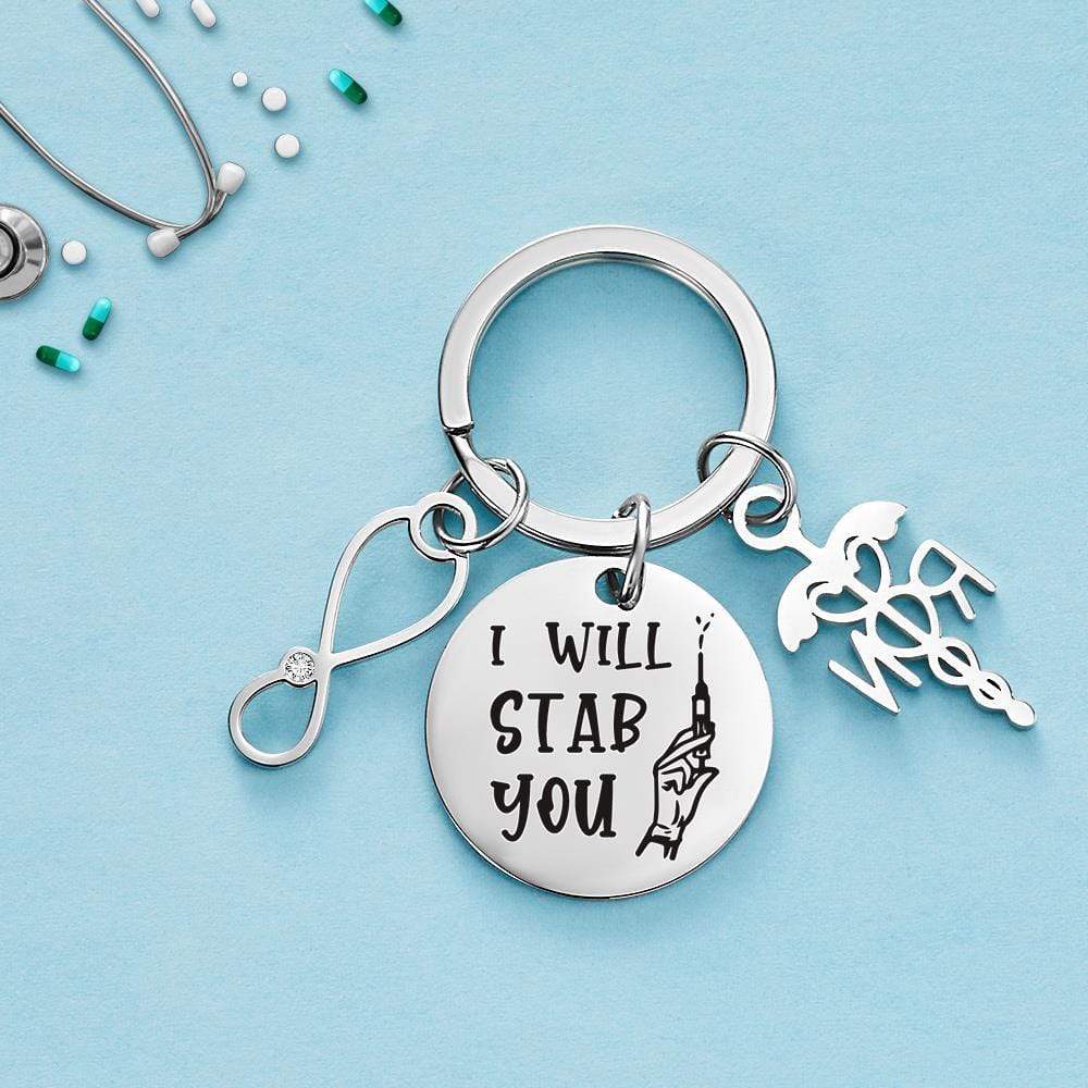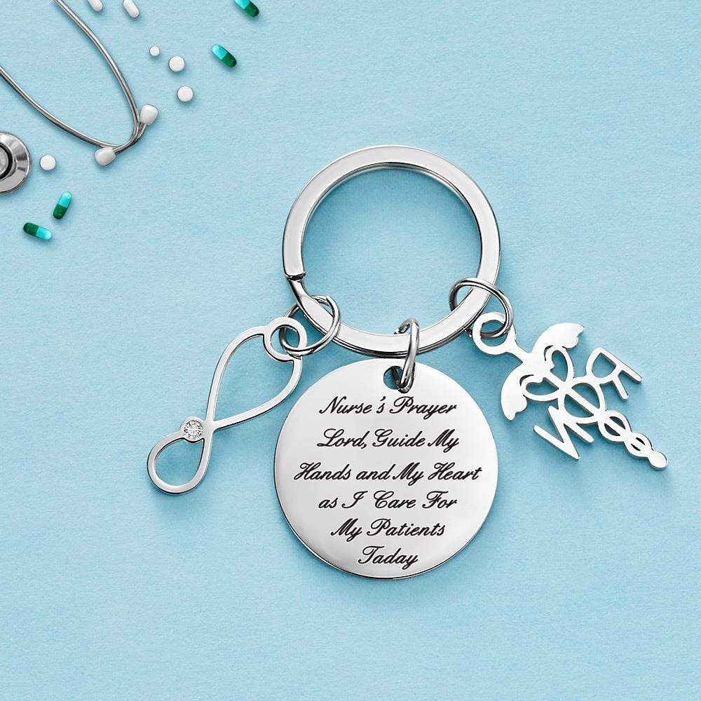 - Porte-clés infirmière personnalisé en argent. C'est un excellent cadeau pour toute infirmière, y compris les étudiants en soins infirmiers ou quelqu'un qui vient de devenir infirmière.