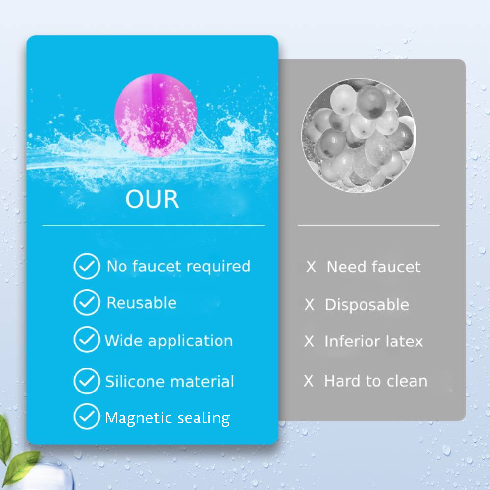 Le nouveau ballon à eau amélioré est fabriqué en silicone durable au lieu du ballon à eau jetable traditionnel, il peut être réutilisé au moins 1000 fois couramment. Dépensez moins d'argent, profitez de plus de bonheur. Dites adieu à vos ballons à eau jetables, nos ballons à eau pour enfants n'ont pas besoin de remplir d'eau avec un robinet qui éclabousse et de sauter le nouage. Il suffit d'ouvrir la boule d'eau, et de la plonger dans l'eau, ce qui permet de rejoindre les jeux d'eau en un minimum de temps ! Nos ballons d'extérieur ne laisseront pas de traces sur le sol, il vous suffit de les rincer, de les sécher et de les ranger. Jouet ballon parfait pour les enfants, les fêtes de piscine et les activités aquatiques en plein air.